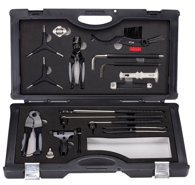 ALLROUNDKIT BTL-91 Caisse à outils robuste contenant les 16 outils les plus utilisés pour l’entretien de votre vélo. Les outils sont nichés dans des espaces dédiées. Espace supplémentaire pour les outils répondant à vos besoins spécifiques. Contenu de la boîte: TurnTable, BTL-11 -Démonte-roue libre). LockOut, BTL-12S -Démonte-contre-écrous. Hexagon 8 mm, BTL-13 – Clé hexagonale. Hexagon 10 mm, BTL-13 – Clé hexagonale. Turner II, BTL-15 -Clé à rayons. ToothBrush, BTL-17 -Brosse à cassette. ThreeStar, BTL-28 -Kit de clés hexagonales. TorxStar, BTL-28T -Jeu de clés Torx. BoldGrip, BTL-32L -Clé pour écrous de plateau. BottomFix, BTL-33L – Démonte-contre-écrous / Clé pour boîtier de pédalier. ChainCecker, BTL-51 – Indicateur d’usure de la chaîne. ProfiCut, BTL-54 – Pince coupe câble. ProfiConnect, BTL-55 – Dérive-chaine. LinkFix, BTL-77 – Pince attache rapide. 2 x ProfiLift, BTL-79 – Démonte pneu.